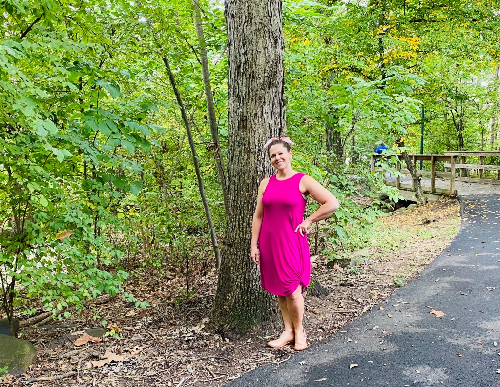 Is that dress a little on the short side? Find yourself walking around on a chilly day? The answer is leggings! I love adding leggings to practically anything in my suitcase because they are good for so many things. Adding a pair to a dress means I can stretch my clothing choice from summer to fall, and even into a mild winter.