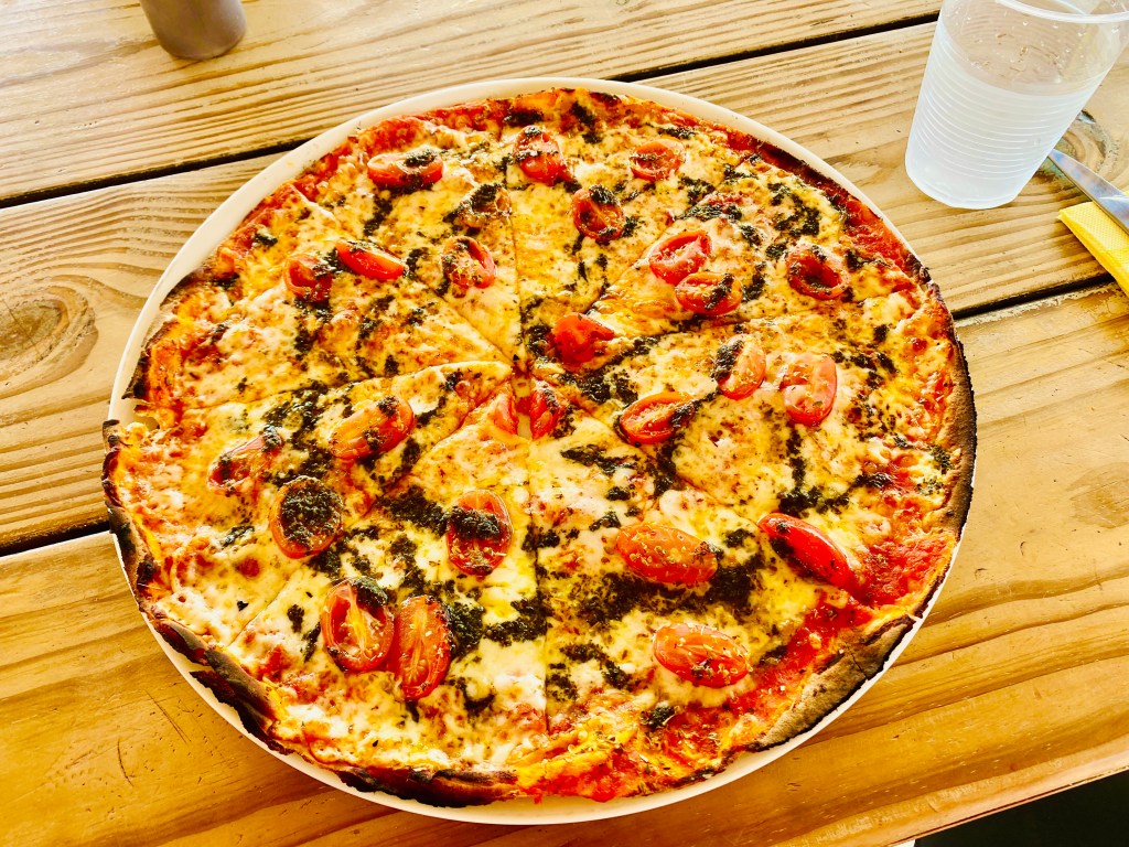 Steve and I opted for pizza with a view! Yellow Beach Restaurant is right on the beach, a few yards from where the ferry docks at the island. They have plenty of other options on the menu, from salad to seafood to barbecue and burgers, but we love pizza! Honestly, we should have split one, but we each got our own instead! Steve got the mushroom pizza; I chose the island’s namesake.